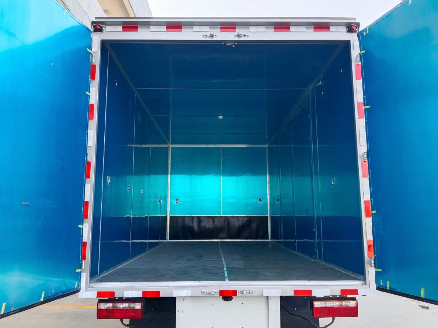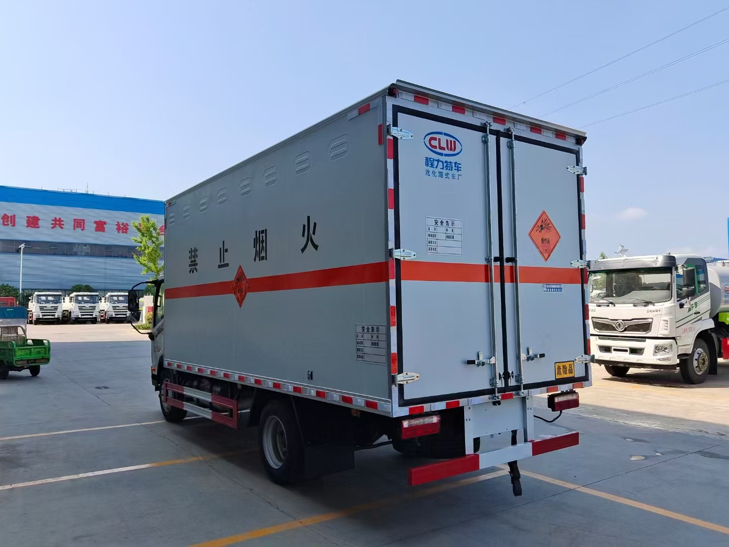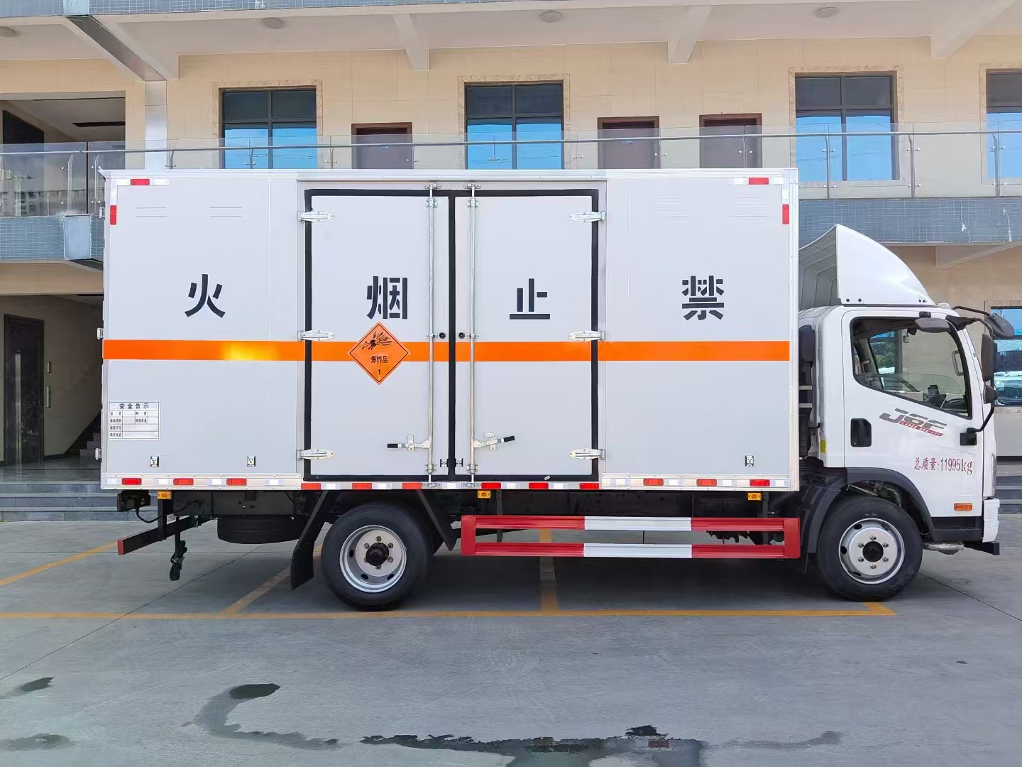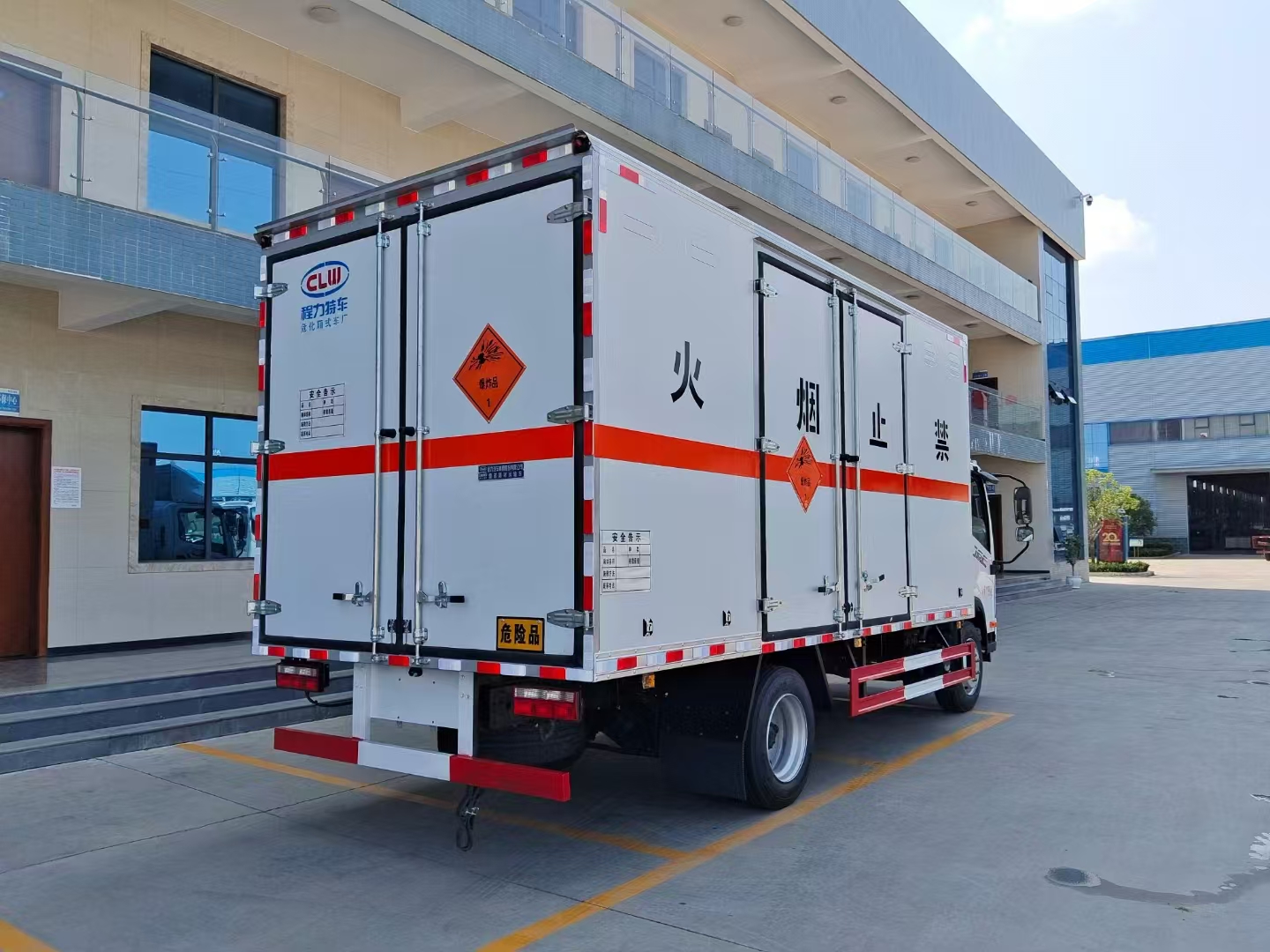 貨箱配置 廂體為雙層金屬骨架結(jié)構(gòu),外板采用冷軋鋼板,中間填充阻燃泡沫,內(nèi)飾為鋁板。底板為平板上鋪防靜電膠皮。廂內(nèi)兩側(cè)加裝固定貨物臥環(huán),門(mén)框帶防盜報(bào)警器,頂部帶煙霧報(bào)警器,廂體右側(cè)選裝側(cè)門(mén),隨車(chē)配2個(gè)滅火器,危險(xiǎn)標(biāo)志牌,防火帽,危險(xiǎn)品三角頂燈。 (尾部可選裝液壓升降尾板)