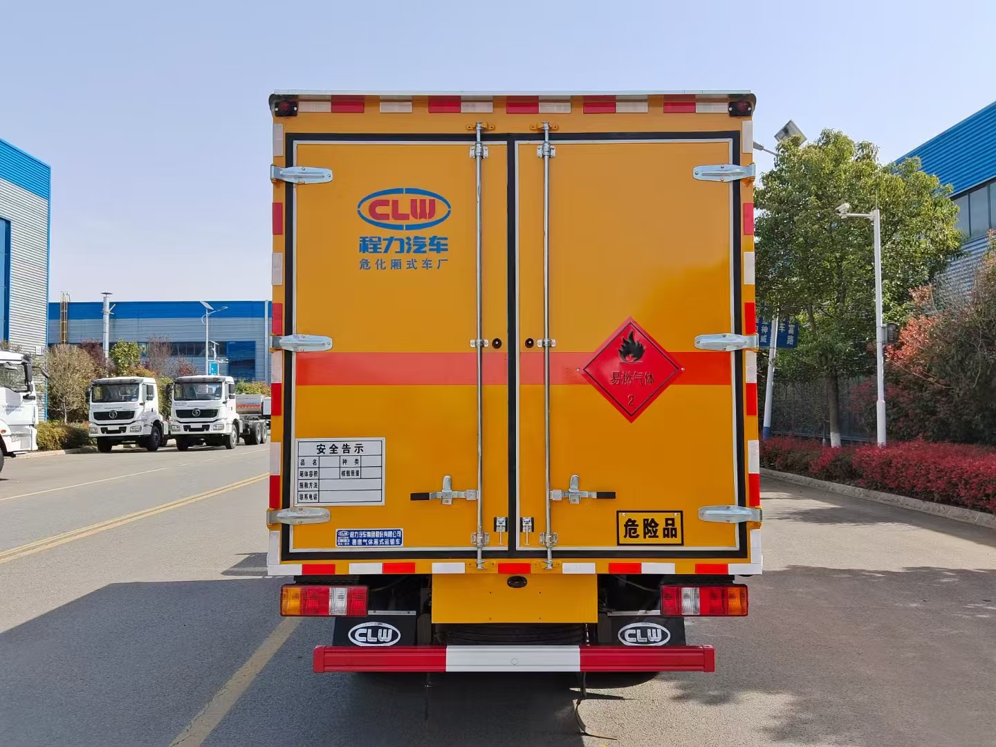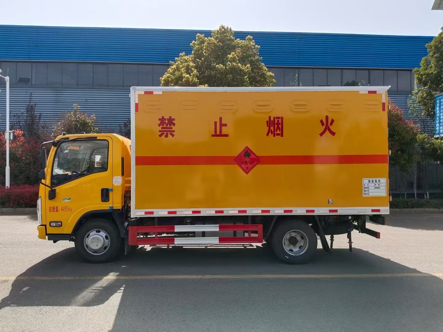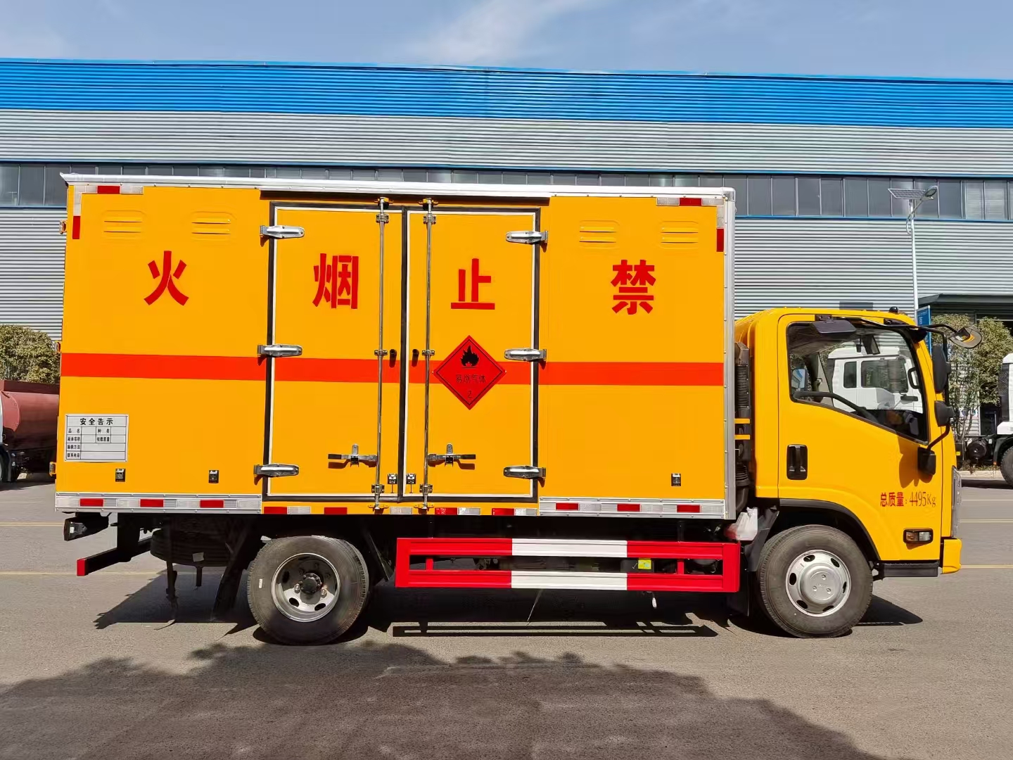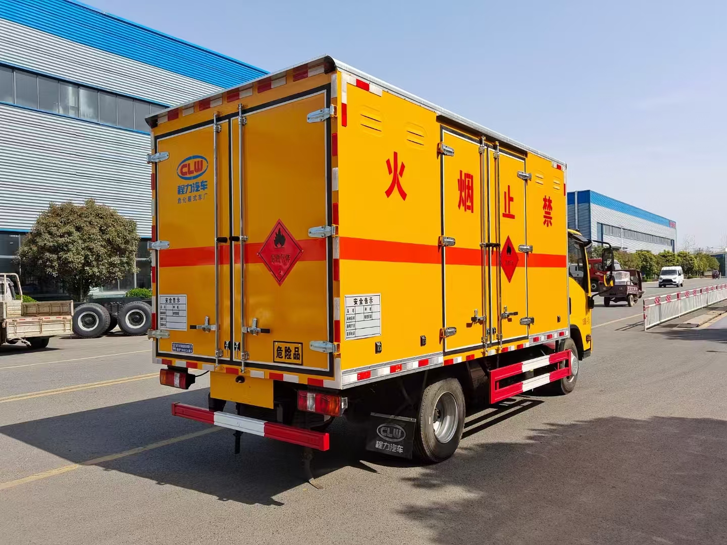 | 貨箱配置 | 廂體為雙層金屬骨架結(jié)構(gòu),外板采用冷軋鋼板,中間填充阻燃泡沫,內(nèi)飾為鋁板。底板為平板上鋪防靜電膠皮。廂內(nèi)兩側(cè)加裝固定貨物臥環(huán),門框帶防盜報(bào)警器,頂部帶煙霧報(bào)警器,廂體右側(cè)選裝側(cè)門,隨車配2個(gè)滅火器,危險(xiǎn)標(biāo)志牌,防火帽,危險(xiǎn)品三角頂燈。 (選裝瓦楞板貨箱) (尾部可選裝液壓升降尾板) | ||