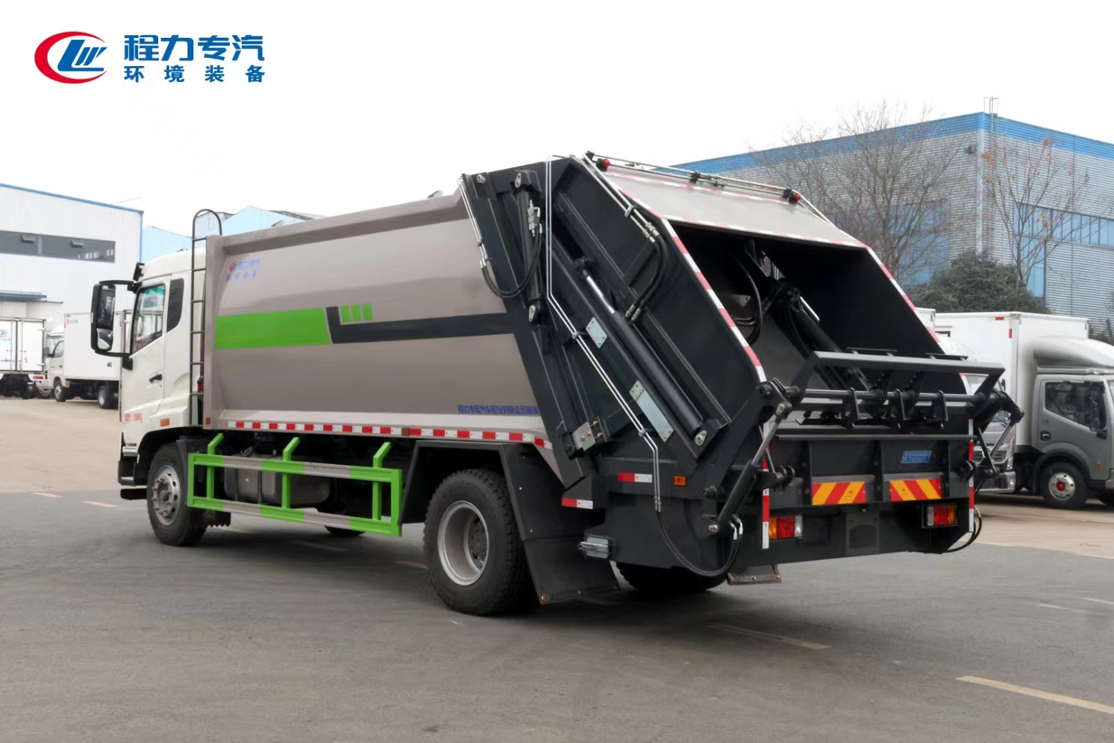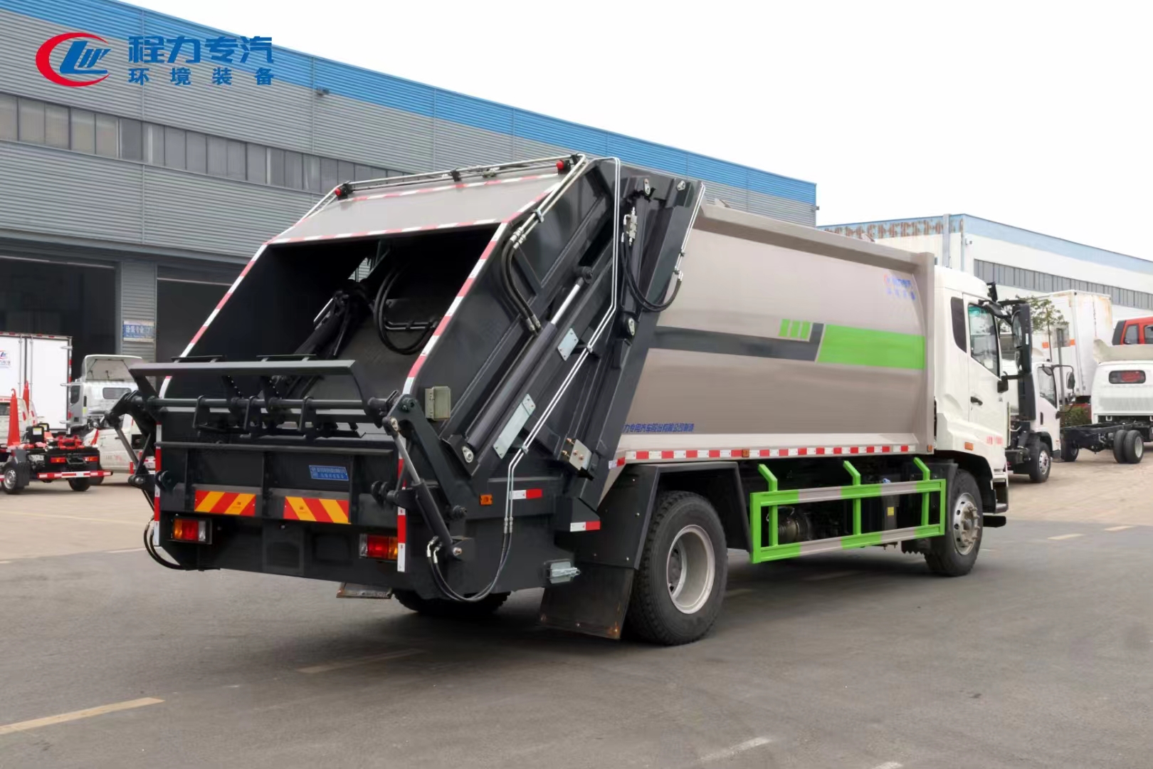 | 上裝配置 | 上裝為弧形箱體結(jié)構(gòu),采用Q345(局部采用T710)高強(qiáng)度板制作。有效容積15-18立方,采用中梅大通徑五聯(lián)手氣一體多路閥,全系標(biāo)配背壓閥(增加雙向壓縮比),合資鐵殼液壓齒輪泵,嘉善取力器,中梅手氣一體多路閥,恒力油缸(質(zhì)保兩年),加強(qiáng)型掛捅后翻轉(zhuǎn)機(jī)構(gòu)(可選裝三角斗、全密封斗、擺臂等翻轉(zhuǎn)機(jī)構(gòu)),外置滑板缸結(jié)構(gòu)設(shè)計(jì),石墨烯尼龍滑塊,長(zhǎng)沙福力CAN總線控制系統(tǒng),尾部帶有硅膠控制面板,標(biāo)配無(wú)線遙控,帶光電感應(yīng)保護(hù)裝置,標(biāo)配后污水箱,(中聯(lián)樣式雙排污口),可加裝側(cè)邊污水箱。加裝氣動(dòng)密封蓋。 | ||
