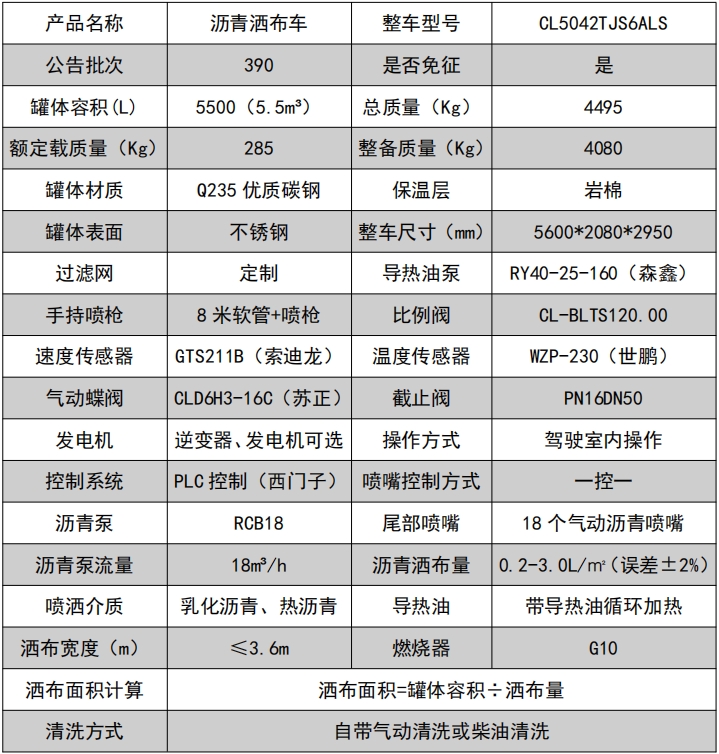 ??????湖北程力汽車:程力CL5042TJS6ALS福田領(lǐng)航 5.5 方藍(lán)牌智能瀝青灑布車產(chǎn)品型號(hào)及參數(shù)配置,程力CL5042TJS6ALS福田領(lǐng)航 5.5 方藍(lán)牌智能瀝青灑布車高清圖片,程力汽車系列程力CL5042TJS6ALS福田領(lǐng)航 5.5 方藍(lán)牌智能瀝青灑布車最新報(bào)價(jià)請撥打客服熱線。整車技術(shù)參數(shù) 產(chǎn)品商標(biāo) 程力牌 公告批次 390 產(chǎn)品名稱 水泥凈漿灑布車 產(chǎn)品型號(hào) CL5042TJS6ALS 總質(zhì)量(Kg) 4495 罐體容積(m3) 額定載質(zhì)量(Kg) 285,220 外形尺寸(mm) 5600 × 2080 × 2950 整備質(zhì)量(Kg) 4080 貨廂...