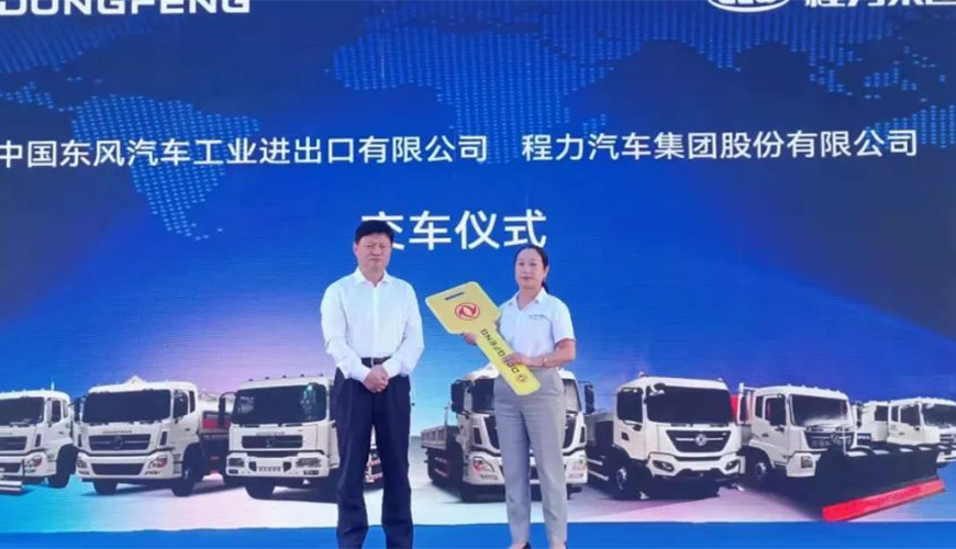 隨后,中國東風(fēng)汽車工業(yè)進出口有限公司商用車海外營銷部中重型產(chǎn)品總監(jiān)吳永剛與程力集團國際市場部業(yè)務(wù)經(jīng)理陳葦舉行了交車鎖匙牌授牌儀式。