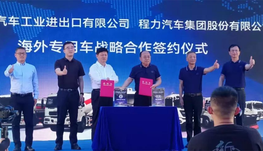 在這次線下大型東風商用車海外市場新產品推薦會上,中國東風汽車工業(yè)進出口有限公司與程力汽車集團股份有限公司聯(lián)合舉行了海外專用車戰(zhàn)略合作簽約儀式,雙方高層領導簽約后合影紀念。